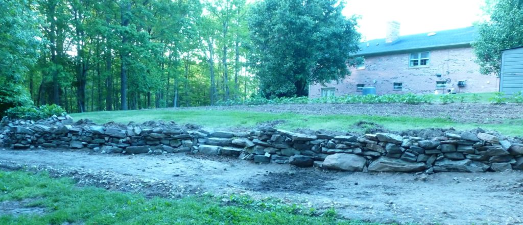 Next, I built a rock wall.  (See picture below—I’m rather proud of it.)  I gathered the rocks from around the property and began landscaping the backyard.  Along with lugging and stacking rocks, I tilled more earth to prepare it for a shade garden filled with hostas, hellebores, ferns, etc.  (This part isn’t visible in the picture because it’s located behind the photographer.)  I also split, loaded, stacked, and hauled around firewood.